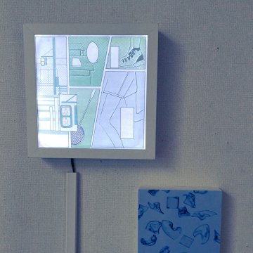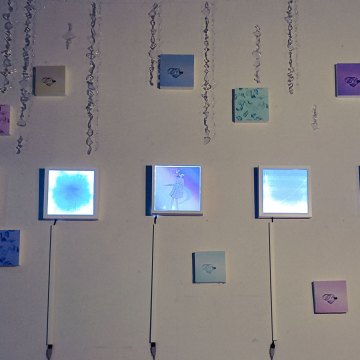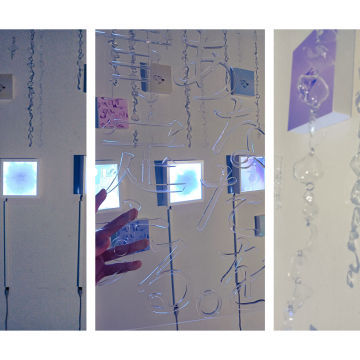 また、全部で5つあるイラスト作品は裏側からLEDライトで照らしている。これは、明かりや光っているものには、肯定感や安心感を与えてくれる効果があるという考えから、作品の要素として取り入れた。