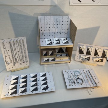 私は、ハンドメイドイベントへの初めての出店を検討する際に直面しやすい、準備・搬入・設営・展示に関する心理的および物理的な負担に着目し、それらを軽減する展示什器を制作しました。